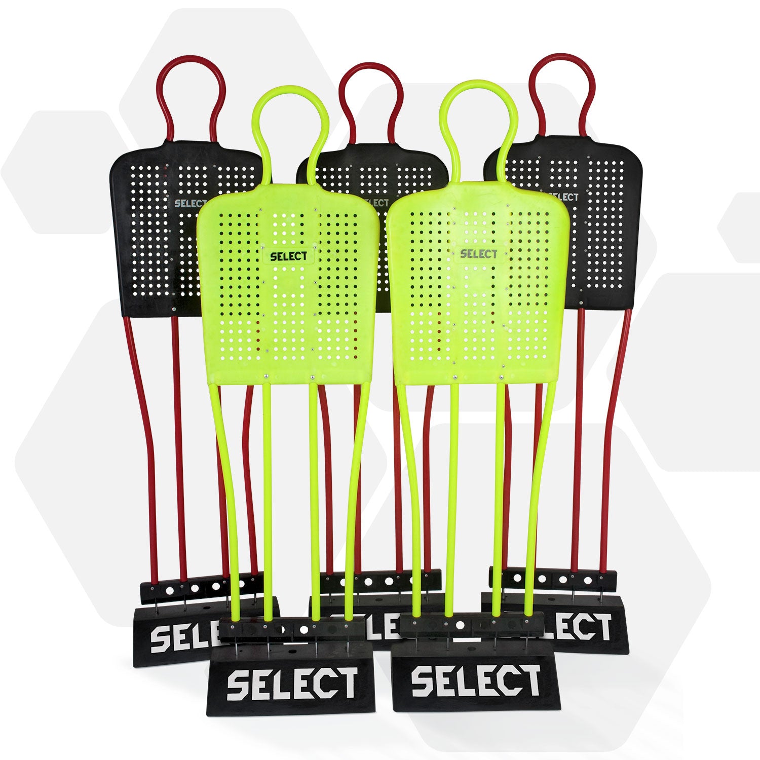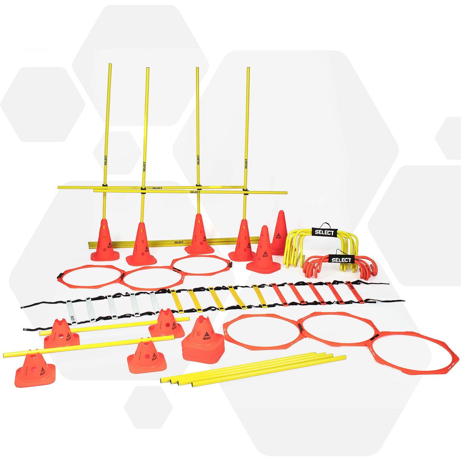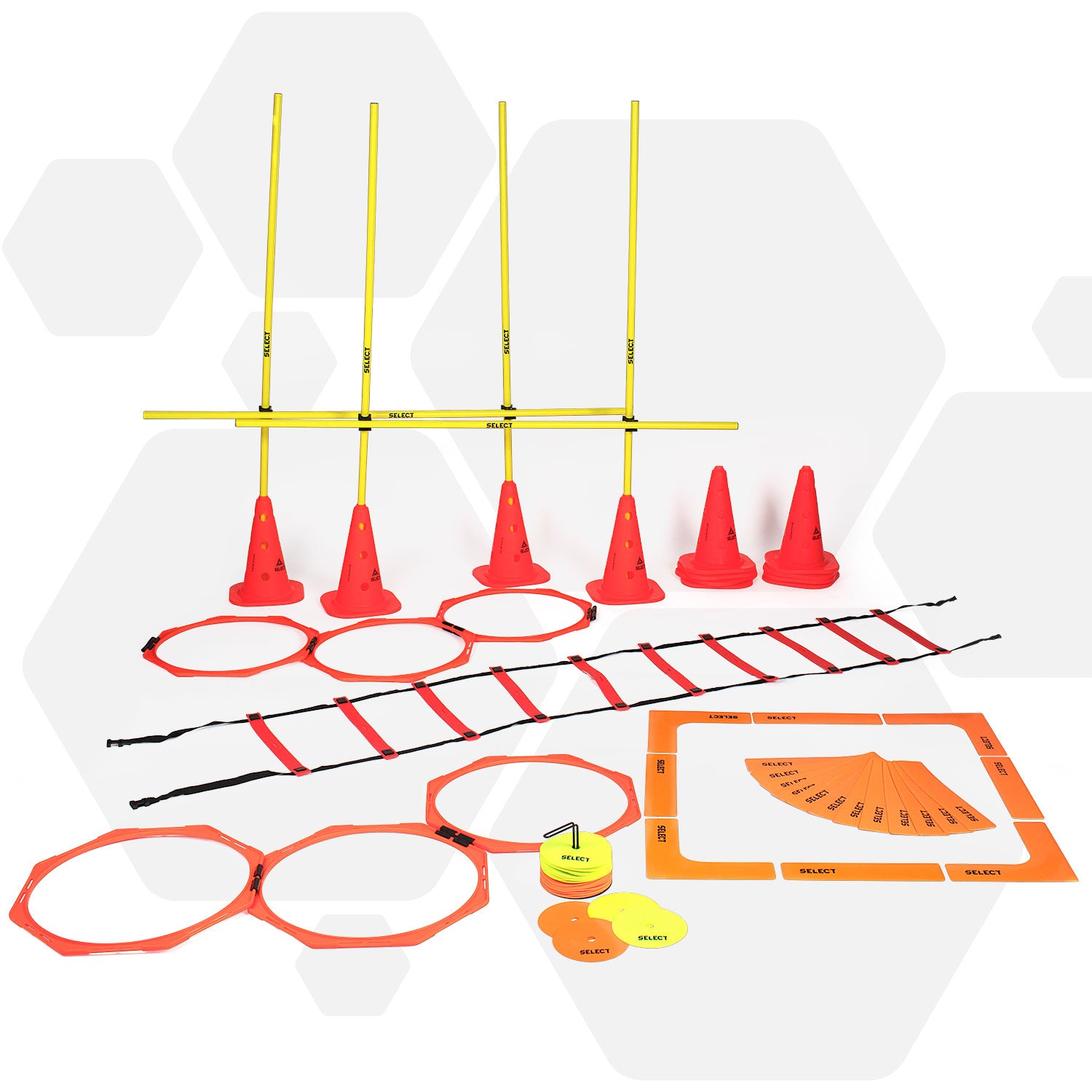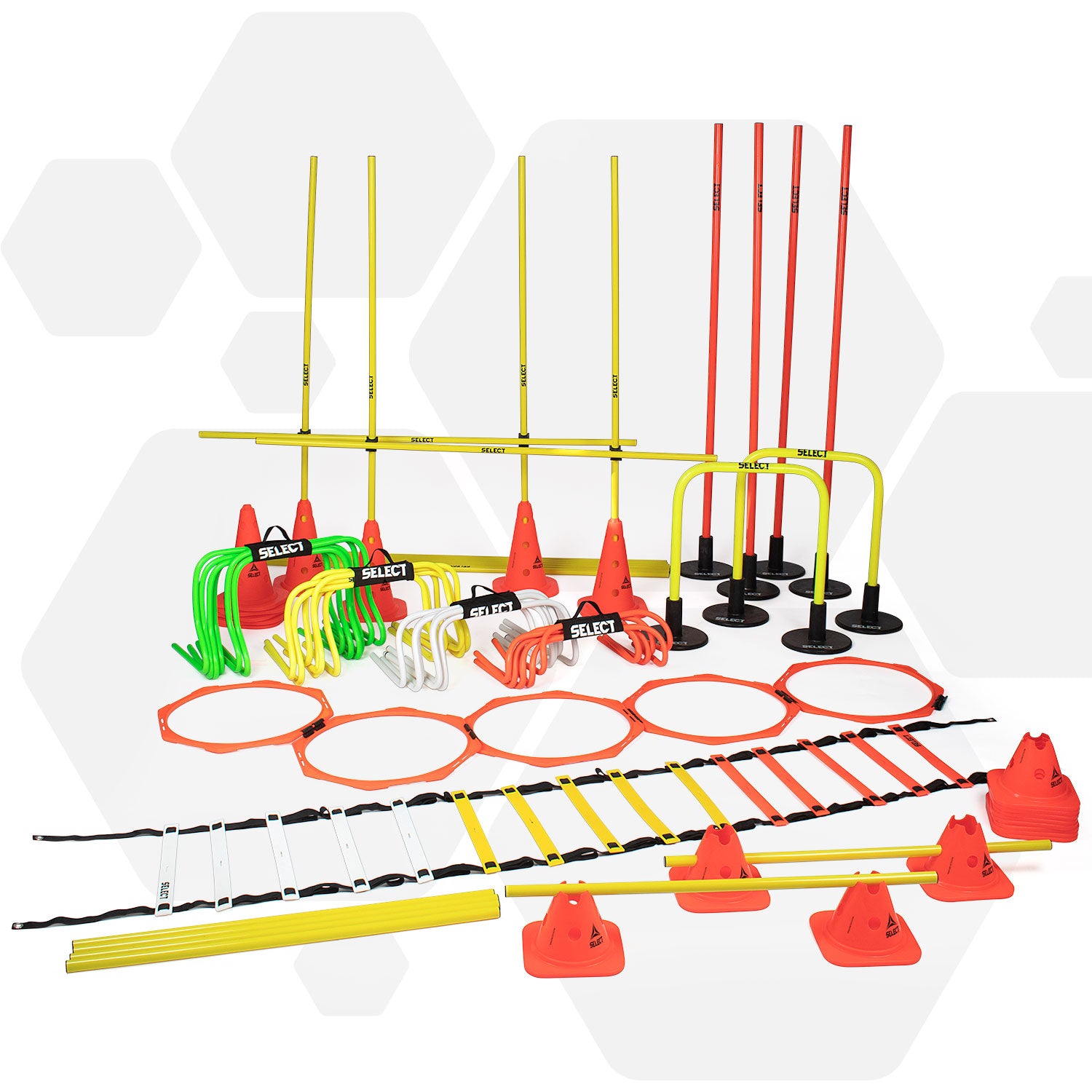 NB: Gummibaser til afleveringsporte og slalom-stænger er ikke inkluderet i pakken. Disse kan købes separat, så udstyret kan bruges på kunstgræsbaner.